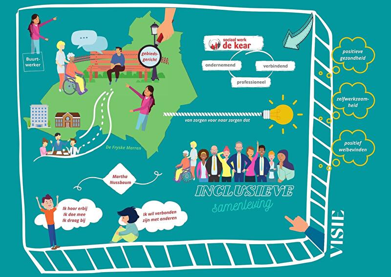Illustratie van de visie van sociaal werkorganisatie 'De Kear' in de gemeente De Fryske Marren. Centraal staat de tekst ‘Inclusieve samenleving’ met mensen van verschillende achtergronden. Links op de kaart van De Fryske Marren zijn buurtwerkers afgebeeld in gesprek met bewoners, waaronder ouderen, gezinnen en mensen in een rolstoel. Bij de kaart staat ‘gebiedsgericht’. Onderin zeggen twee personen: “Ik hoor erbij, ik doe mee, ik draag bij” en “Ik wil verbonden zijn met anderen”, met een verwijzing naar Martha Nussbaum. Rechtsboven staan kernwaarden van De Kear: ‘ondernemend’, ‘verbindend’, ‘professioneel’. Daaronder drie gele gedachtenwolken: ‘positieve gezondheid’, ‘zelfwerkzaamheid’ en ‘positief welbevinden’. Onderaan staat ‘visie’ als label. In het midden een gloeilamp met de tekst: “van zorgen voor naar zorgen dat”.